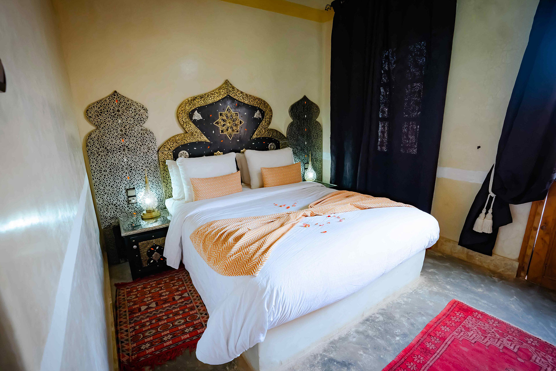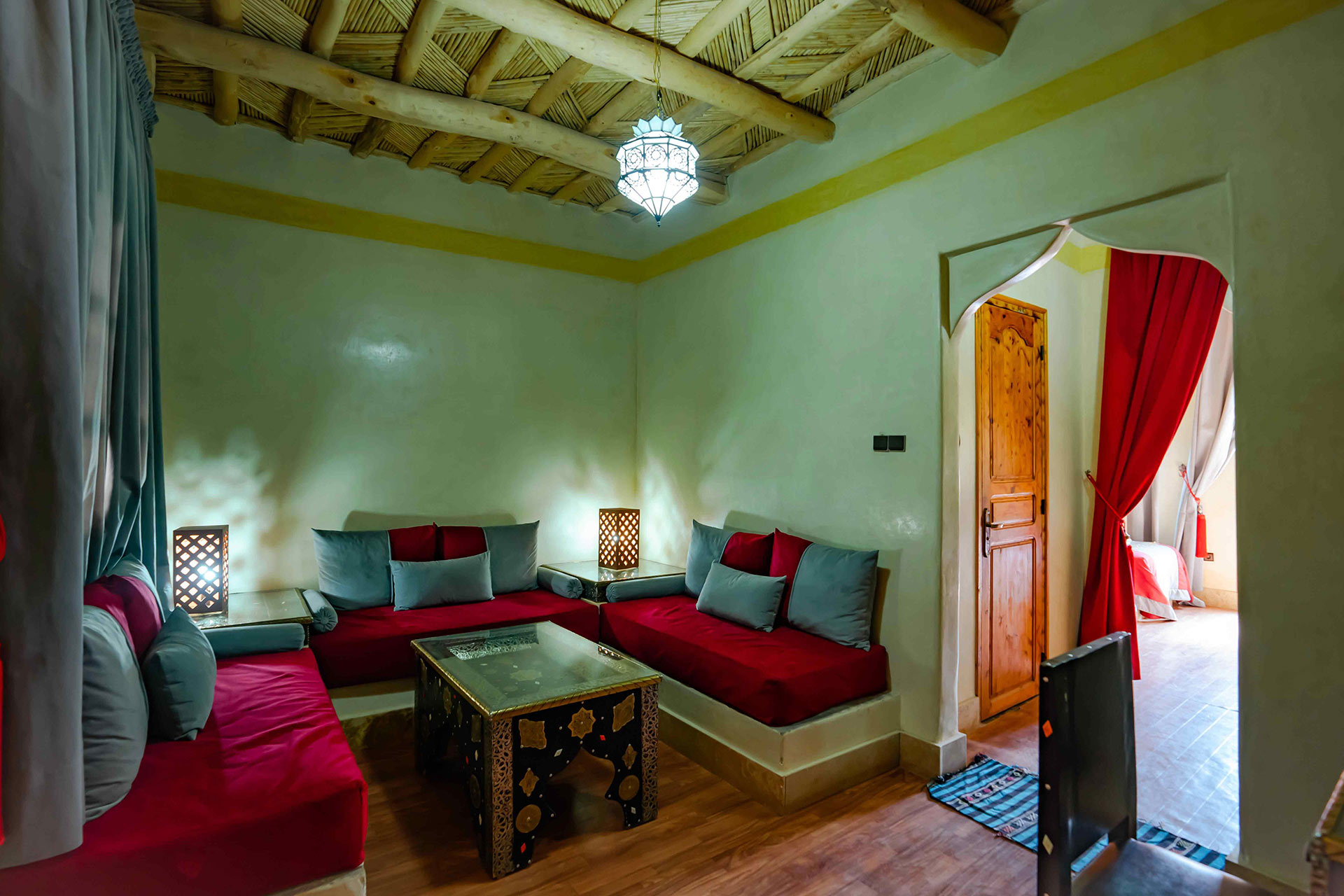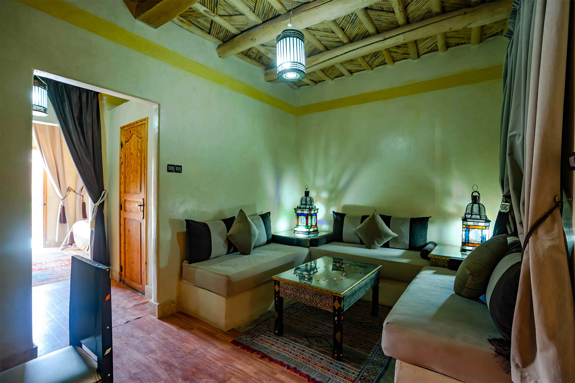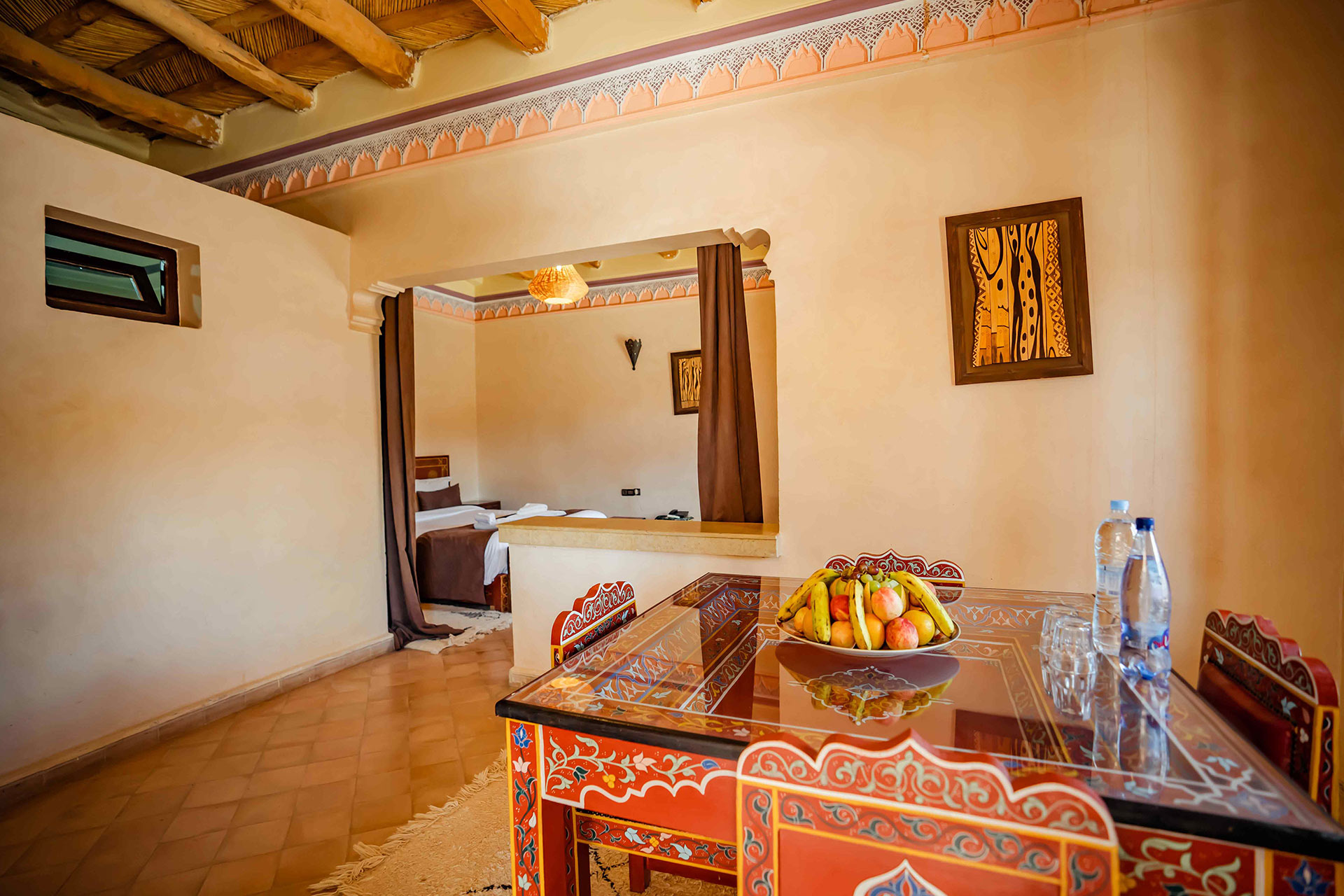Les suites Premium élèvent l’expérience des chambres standard à une version luxueuse. Ces suites offrent un espace supplémentaire et une vue imprenable sur la vallée de Dades. Chacune d’entre elles est méticuleusement décorée avec des meubles rares, incarnant un caractère unique. La Suite familiale, pensée comme un véritable appartement, propose deux chambres spacieuses, une salle de bain, un grand dressing, et un coin salon.